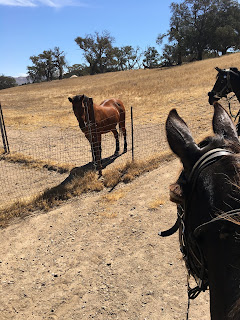 The summer heat is beginning to abate, so it was time for a short ride out at the old favorite Live Oak Camp. A light breeze was blowing and the sky was filled with wispy cirrus clouds, known as "Mare's tails" and quite appropriate for 3 horses and a mule to take a walk.